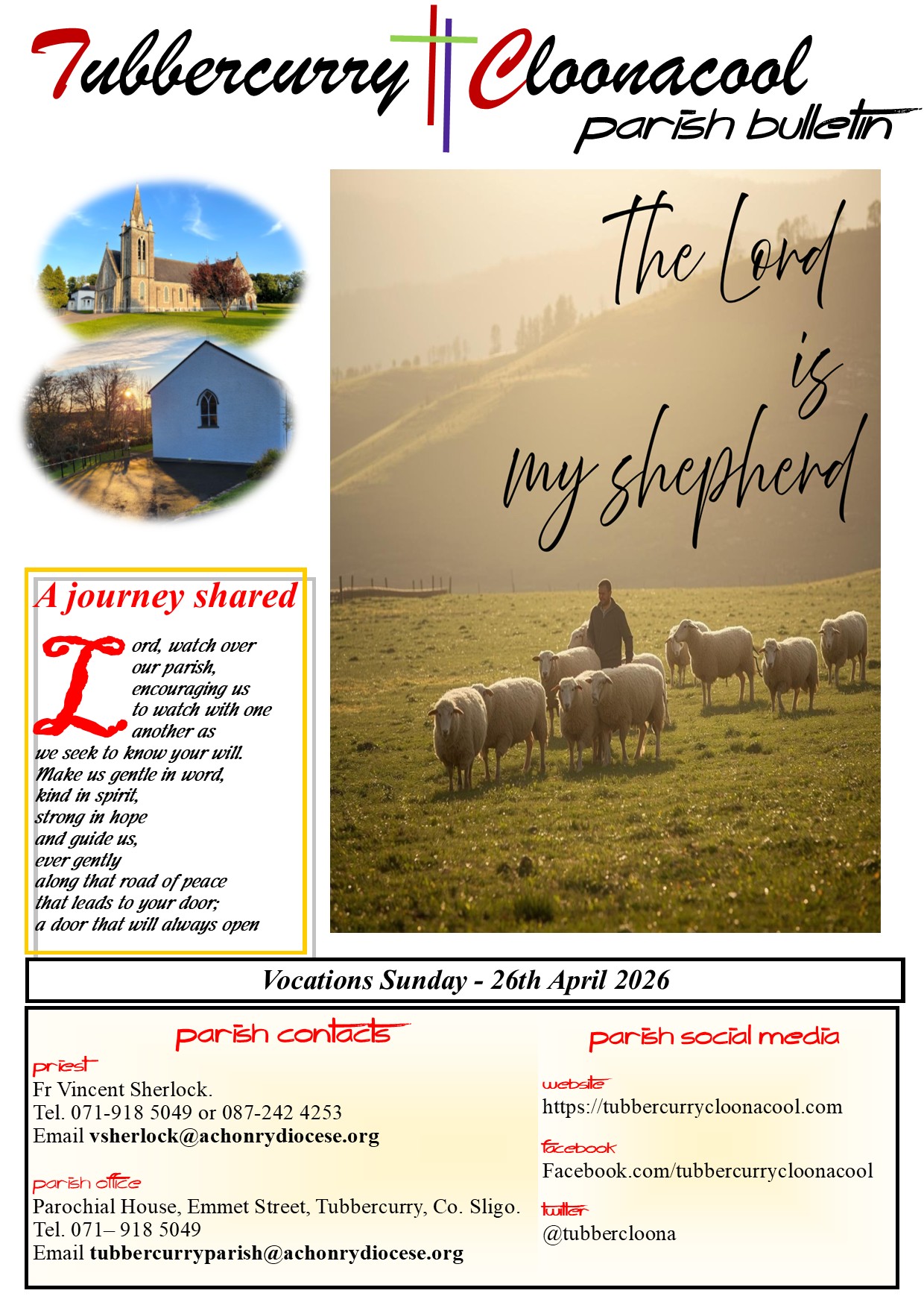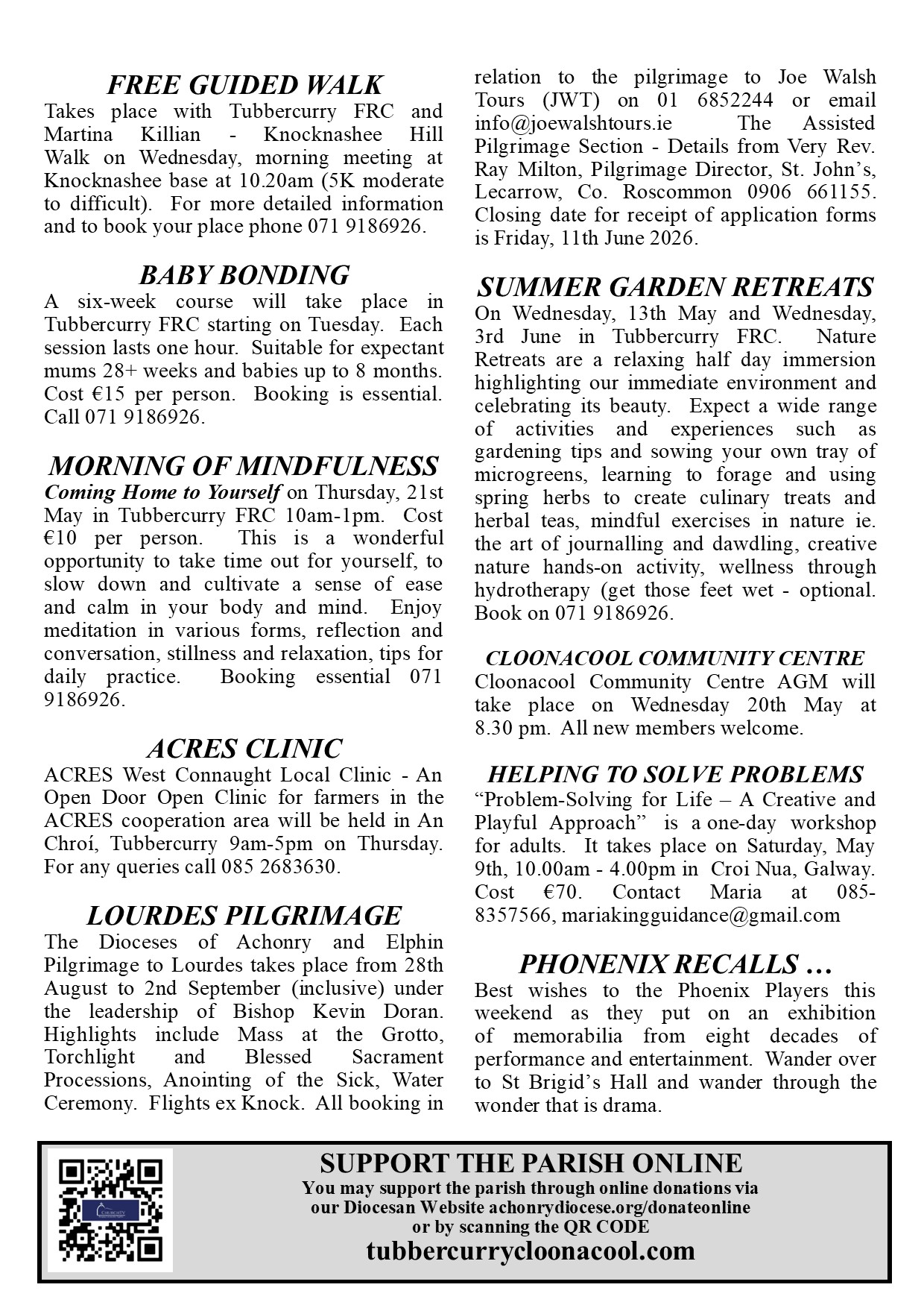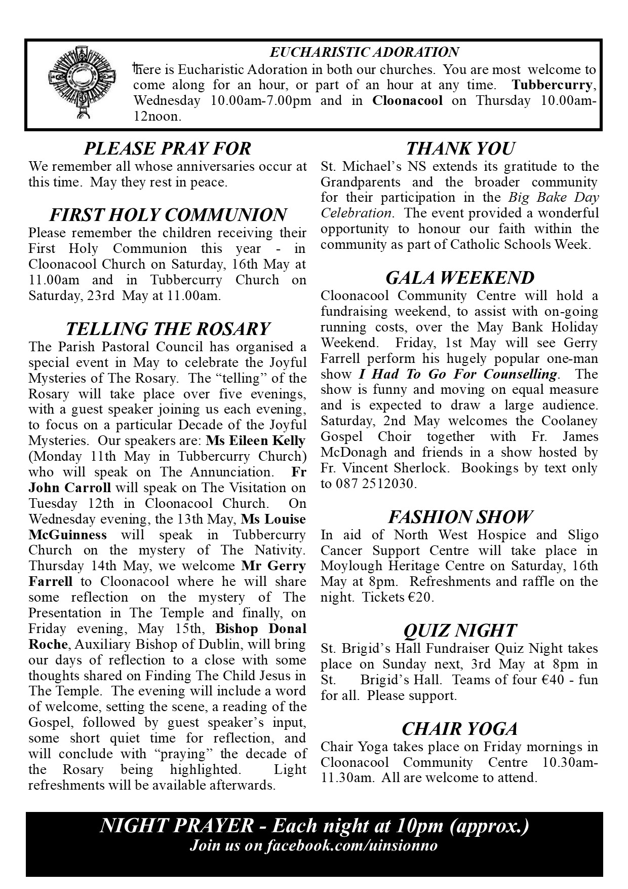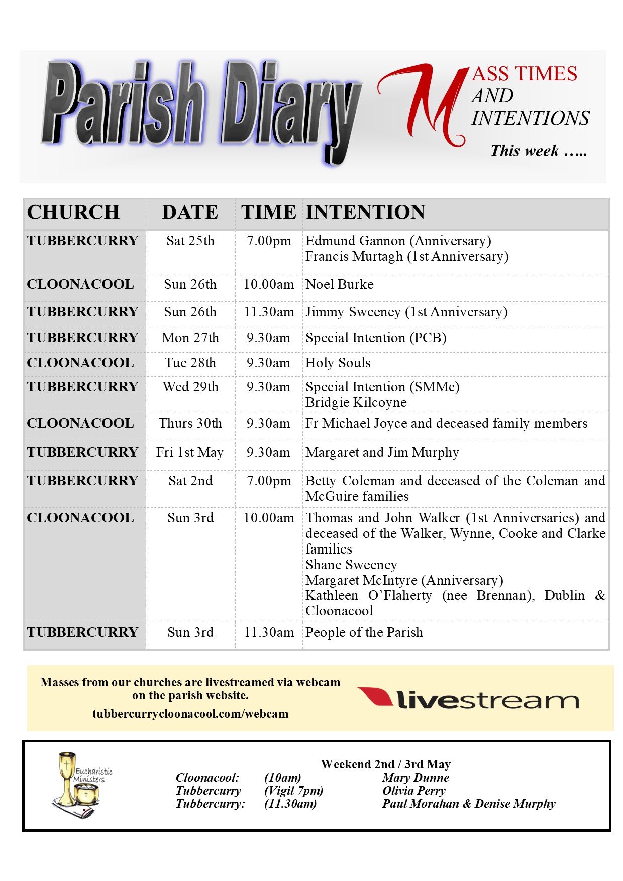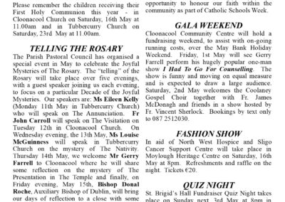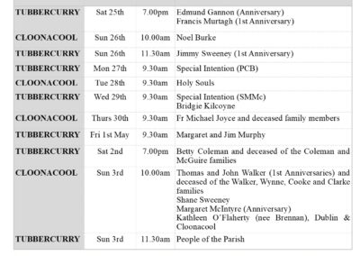 The Parish Bulletin is a weekly publication that updates you to life events in our parish.  It outlines Mass Times and Intentions, publicises local events, organised by voluntary groups and offeres a reflection on the Gospel or other theme.